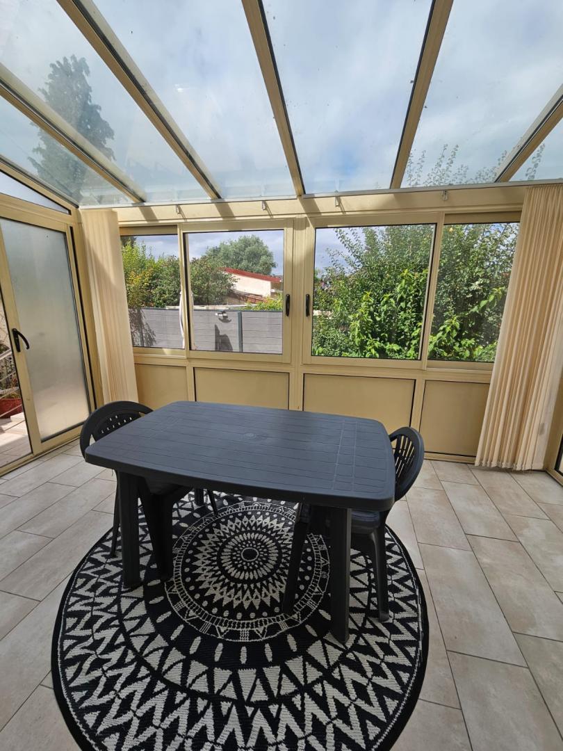 Une véranda avec 1 canapé et 1 fauteuil, une table de jardin 4 places. Une terrasse avec salon de jardin et parasol , barbecue charbon de bois.